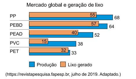 (GRÁFICOS) D (INSPER 2020-1) Estima-se que 8,9 bilhões de toneladas de plásticos já foram fabricados desde meados do século passado, quando começaram a ser produzidos em escala industrial.