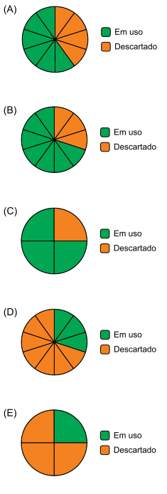 Dessa quantidade de plástico fabricado, parte está em uso e o restante foi descartado, sendo que a quantidade de plástico descartado supera em 3,7 bilhões de toneladas a quantidade de plástico em uso. Assim, o gráfi co de setores que melhor representa a quantidade de plástico em uso e descartado é: