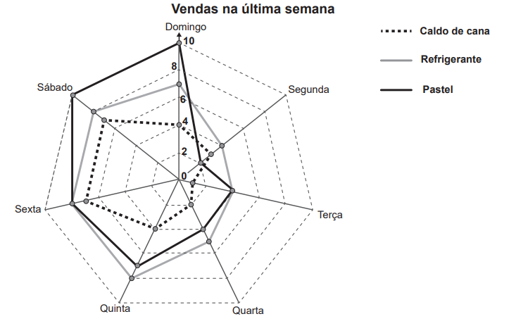 (GRÁFICOS) B (ENEM 2019) Um comerciante, que vende somente pastel, refrigerante em lata e caldo de cana em copos, fez um levantamento das vendas realizadas durante a semana. O resultado desse levantamento está apresentado no gráfico.