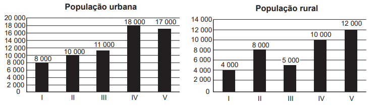 (GRÁFICOS) C (ENEM 2019) A taxa de urbanização de um município é dada pela razão entre a população urbana e a população total do município (isto é, a soma das populações rural e urbana). Os gráficos apresentam, respectivamente, a população urbana e a população rural de cinco municípios (I, II, III, IV, V) de uma mesma região estadual. Em reunião entre o governo do estado e os prefeitos desses municípios, ficou acordado que o município com maior taxa de urbanização receberá um investimento extra em infraestrutura.
