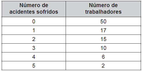 D (ENEM 2018) A Comissão Interna de Prevenção de Acidentes (CIPA) de uma empresa, observando os altos custos com os frequentes acidentes de trabalho ocorridos, fez, a pedido da diretoria, uma pesquisa do número de acidentes sofridos por funcionários. Essa pesquisa, realizada com uma amostra de 100 funcionários, norteará as ações da empresa na política de segurança no trabalho. Os resultados obtidos estão no quadro.