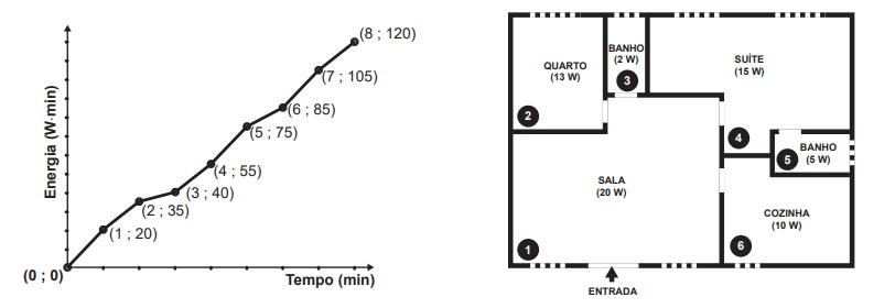 O morador dessa casa visitou alguns desses cômodos, ficando exatamente um minuto em cada um deles. O gráfico descreve o consumo acumulado de energia, em watt x minuto, em função do tempo t, em minuto, das lâmpadas de LED dessa casa, enquanto a figura apresenta a planta baixa da casa, na qual os cômodos estão numerados de 1 a 6, com as potências das respectivas lâmpadas indicadas.