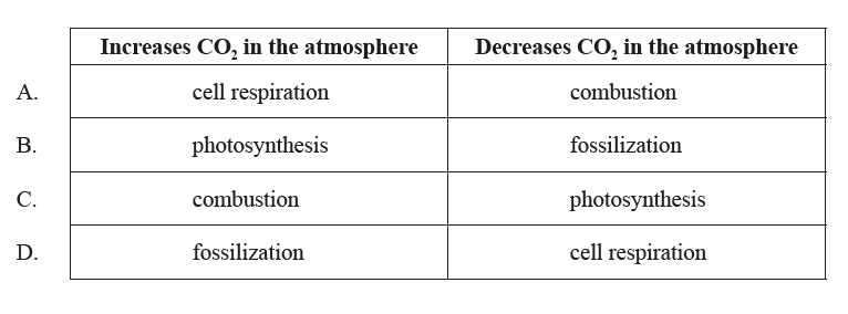 In the carbon cycle, which pair shows the correct change in atmospheric composition?