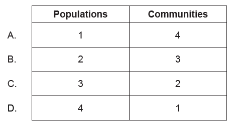 In a rock pool a student observes four different species of animal. She sees 43 flat periwinkles (Littorina littoralis), ten rough periwinkles (Littorina saxatilis), three shore crabs (Carcinus maenas) and one common goby (Pomatoschistus microps). How many populations and communities did she see in the pool?
