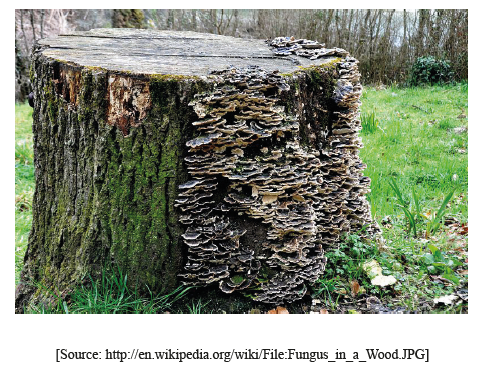 What type of organism is growing on the surface of this dead wood?