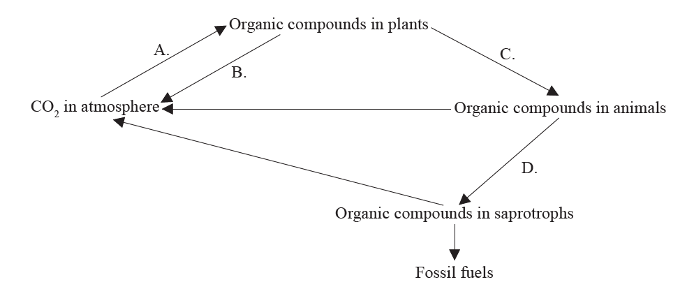 The diagram shows the carbon cycle. Which letter indicates respiration?