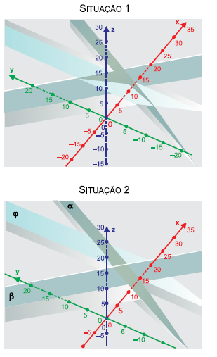 Na situação 1, em que os três planos se encontram em um único ponto, o sistema linear é possível e determinado, com m _____________. Na situação 2, o plano representa a equação 3, com parâmetro m igual a _________.
