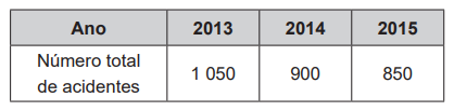 (PA) D (ENEM 2019) O slogan “Se beber não dirija”, muito utilizado em campanhas publicitárias no Brasil, chama a atenção para o grave problema da ingestão de bebida alcoólica por motoristas e suas consequências para o trânsito. A gravidade desse problema pode ser percebida observando como o assunto é tratado pelo Código de Trânsito Brasileiro. Em 2013, a quantidade máxima de álcool permitida no sangue do condutor de um veículo, que já era pequena, foi reduzida, e o valor da multa para motoristas alcoolizados foi aumentada. Em consequência dessas mudanças, observou-se queda no número de acidentes registrados em uma suposta rodovia nos anos que se seguiram às mudanças implantadas em 2013, conforme dados no quadro.